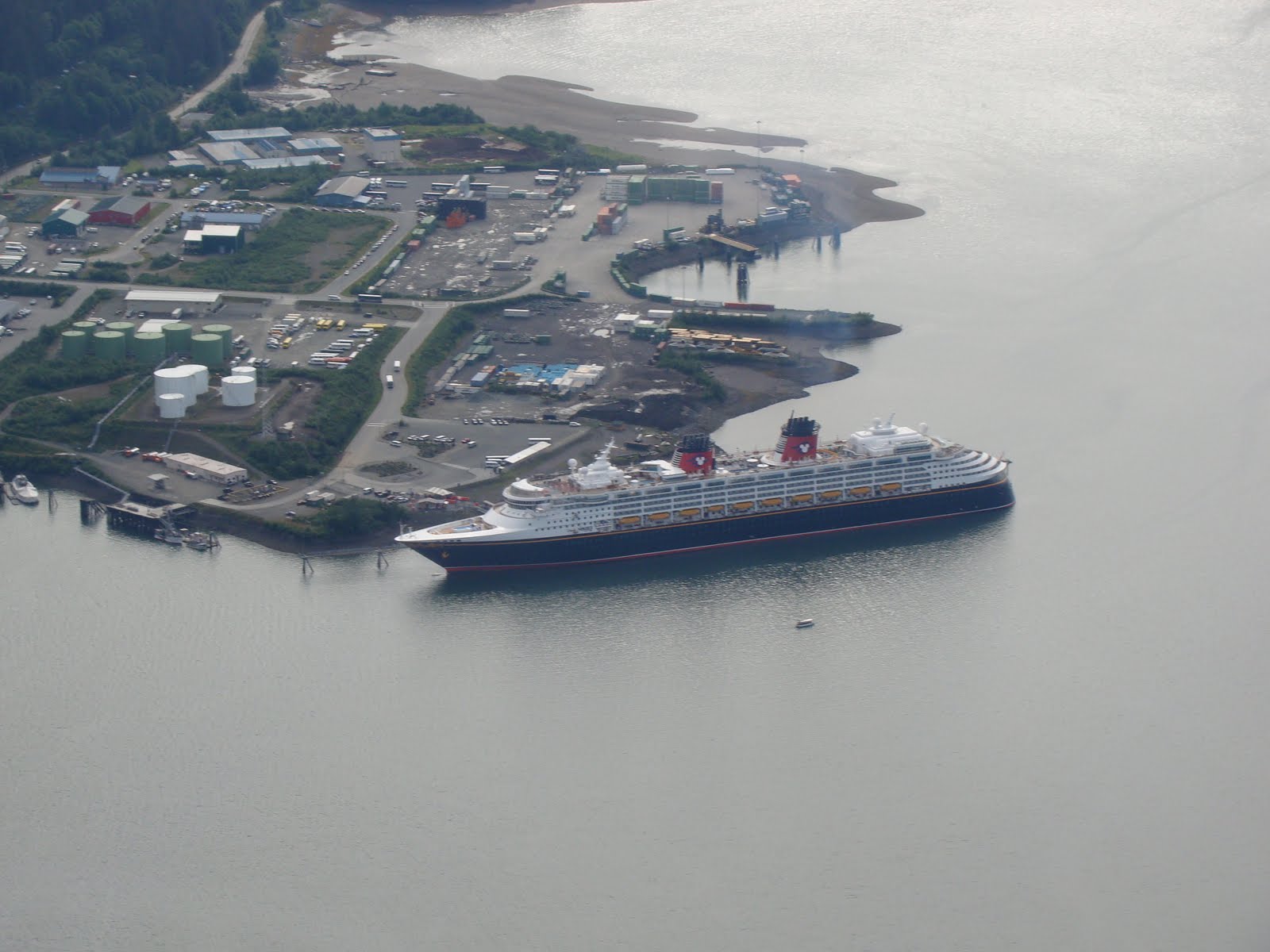 Our Alaska cruise made the three traditional port stops - Skagway, Juneau, and Ketchikan. Our first stop, Skagway, was supposed to be our glacier tour via helicopter culminating in a dog sled ride on a glacier. However, as soon as we woke up that morning, we pretty much knew that it was not going to happen due to the heavy fog (see picture below). We did end up being canceled, so we spent a few hours shopping in the town. The town was very cute - wood sidewalks, the storefronts were coordinated and reminiscent of the early gold rush days of the town. Here is the Disney Wonder from land.