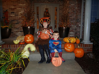The kids ready for the Illini Country Club Halloween Party. Ethan is Superman and Olivia is a "Cutie Hootie Owl".